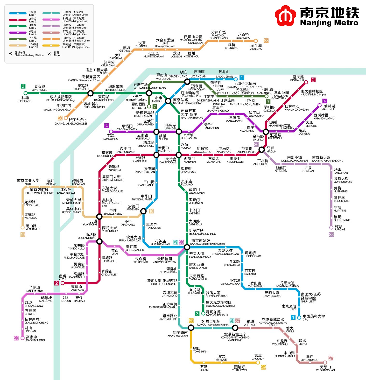 - Line S1 (Emerald Green) – Also known as the Ninggao Line, Line S1 has been in operation since 2014. It runs from the Jiangning area to the town of Gaochun. Currently, only the first phase of the project has been completed, linking the South Railway Station to Lukou International Airport over 35.8 kilometres with 8 stations. When completed, it will include 14 stations and cover 88 kilometres.
