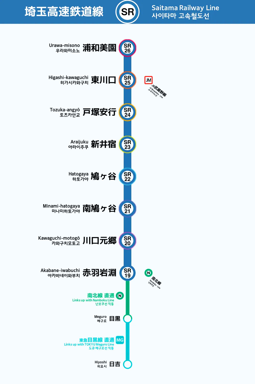 Through the Namboku Line, passengers can transfer to many Tokyo Metro and Toei lines. At Meguro, connections to the JR Yamanote Line are available. At Shin-Yokohama, some trains allow transfer to the Tokaido Shinkansen. As a result, the Saitama Rapid Railway links passengers to a wide regional rail network.