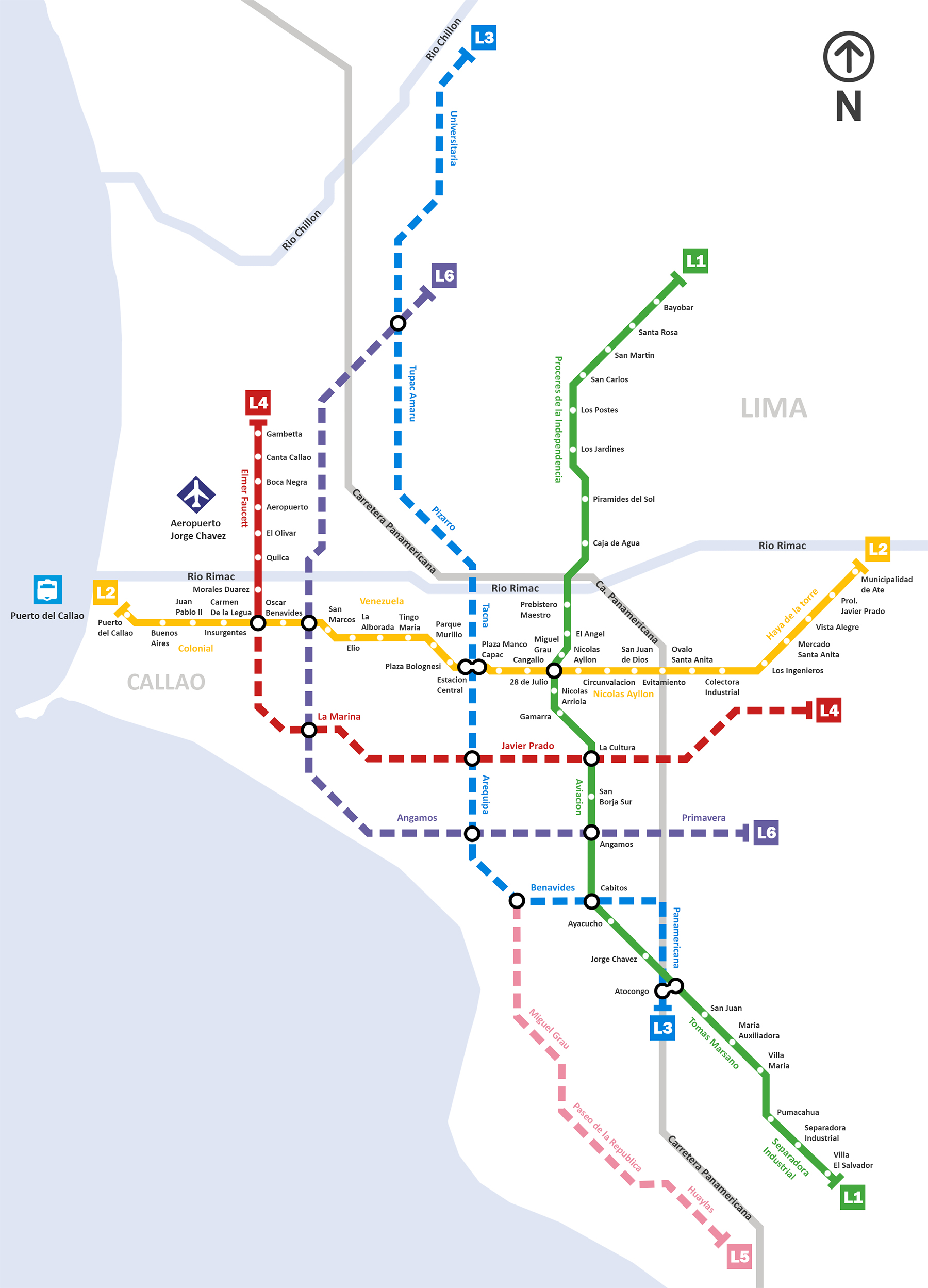 Following the approval of the project, the contractor decided to build Line 2 entirely underground. This line will connect the city from east to west and will meet Line 1 at the 28 de Julio station. This line will also have a connection to the Metropolitan Bus Station in Plaza Grau. The same company will also be responsible for the construction of the first 8 kilometres of Line 4. Line 4 will run from the north to the south of the city and will include a stop at the Jorge Chavez International Airport.